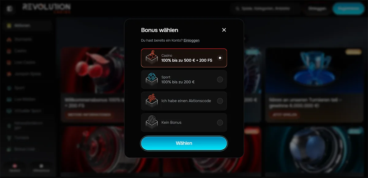 Der Revolution Casino Bonus für Neukunden ist außergewöhnlich großzügig gestaltet. Der Revolution Casino Einzahlungsbonus verdoppelt die erste Einzahlung mit einem 100 % Bonus. Zusätzlich erhalten Spieler Free Spins für ausgewählte Slots. Diese Spins können für verschiedene Premium-Titel genutzt werden. Das Revolution Casino Free Spins Paket umfasst insgesamt 200 Drehungen. Die Casino Free Spins werden über mehrere Tage gutgeschrieben. Die Revolution Casino Freispiele haben faire Umsatzbedingungen. Die Mindesteinzahlung für den Willkommensbonus ist niedrig angesetzt. Die Mindesteinzahlung beträgt nur 10 Euro, was den Einstieg erleichtert. Der Mindestbetrag beträgt somit nur einen Bruchteil des maximalen Bonusbetrags.
