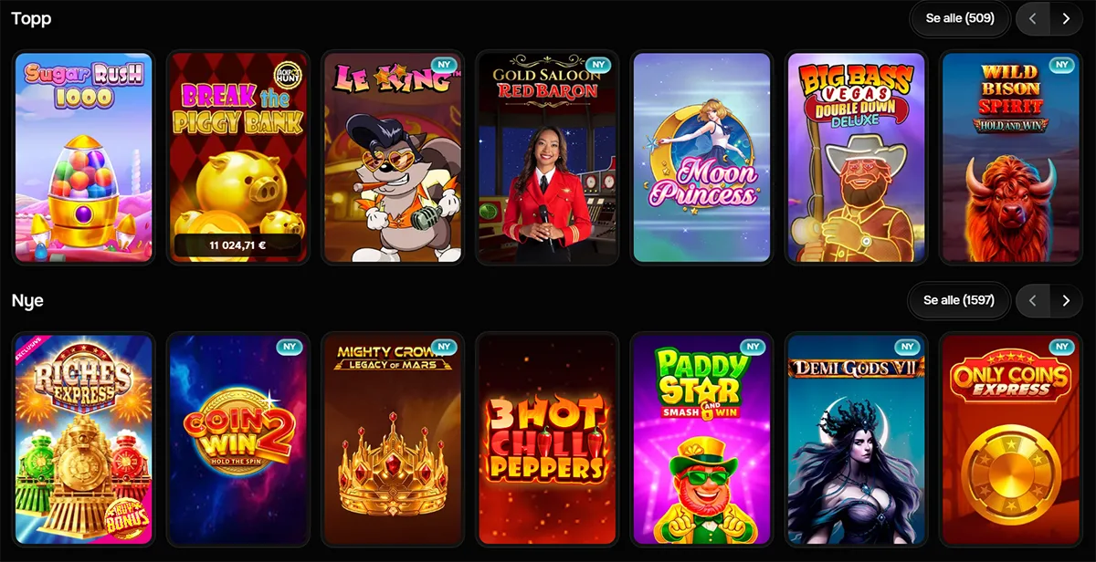 NetEnt og Pragmatic Play dominerer spillutvalget med høy RTP-spilleautomater som gir rettferdige spill. Vi observerer at spillere særlig foretrekker Book of Dead og Gates of Olympus for deres bonusrunder og gratisspinn-funksjoner.